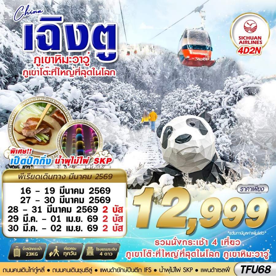 | วันที่ 2 | ท่าอากาศยานเฉิงตูเทียนฟู่ – เดินทางไปภูเขาหิมะวาวู่ – ขึ้นกระเช้าชมภูเขาโต๊ะที่ใหญ่ที่สุดในโลก (รวมกระเช้า 4 เที่ยว) |