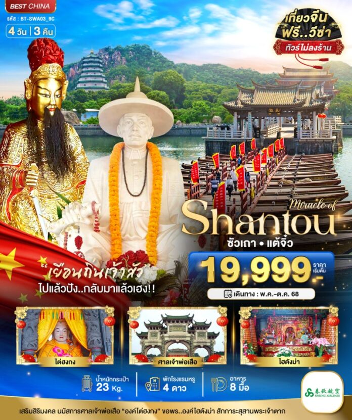ทัวร์ซัวเถา จัดทัวร์จีนในราคาพิเศษกับเส้นทาง ทัวร์ซัวเถา ทัวร์ซัวเถาราคาถูก นมัสการศาลเจ้าพ่อเสือ เจ้าแม่ทับทิม เที่ยวเต็มอิมกับเส้นทางซัวเถา จองได้ตั้งแต่ 1 ท่านขึ้นไป จัดกรุ๊ปซัวเถา กับเราได้ในราคาพิเศษ โปรโมชั่นตลอดปี