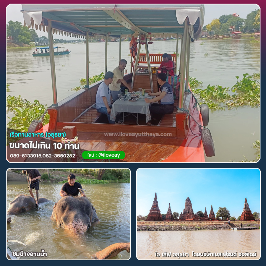 ล่องเรือกินข้าวอยุธยา เริ่มต้น 2,990 บาท ล่องเรือกินข้าวอยุธยา ล่องเรือกินข้าวอยุธยาราคาถูก บริการล่องเรือไม้ทานอาหารมื้อกลาวัน มื้อเย็น ล่องเรืออยุธยา พาทุกท่านชมโบราณสถานที่สำคัญของ จ.พระนครศรีอยุธยา ผ่านชมวัดไชยวัฒนาราม วัดพุธไทศวรรย์ วัดพนัญเชิง และสถานที่ท่องเที่ยวอื่นๆ นอกจากนี้เรายังมีไฮไลท์พิเศษ พาท่านไปดูน้องช้างอาบน้ำ ชมช้างอาบน้ำ พร้อมให้อาหารน้องช้าง