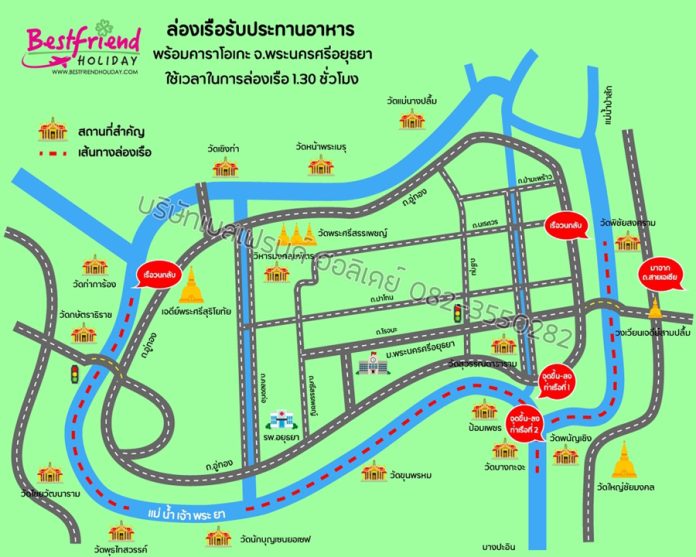 แผนที่ สถานที่เรือผ่านชม ล่องเรืออยุธยา โดยบริษัทเบสเฟรนด์ ฮอลิเดย์