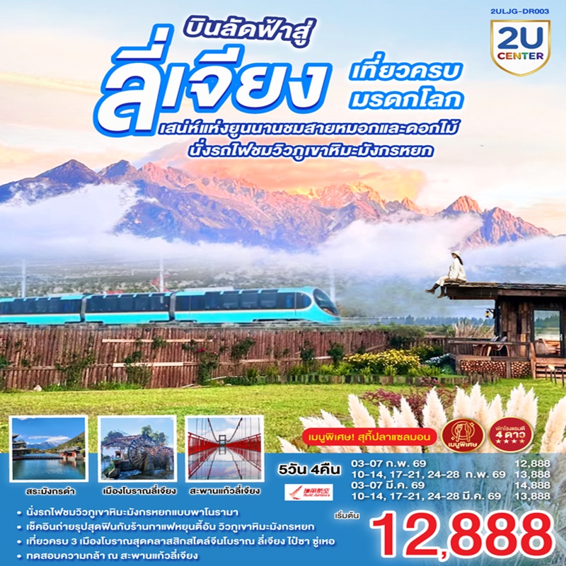 | วันที่ 2 | นั่งรถไฟชมวิวภูเขาหิมะมังกรหยก-หุบเขาพระจันทร์สีน้ำเงิน (ไม่รวมค่ารถแบตเตอรี่)-ทะเลสาบไป๋สุ่ยเหอ- เมืองโบราณซู่เหอ |