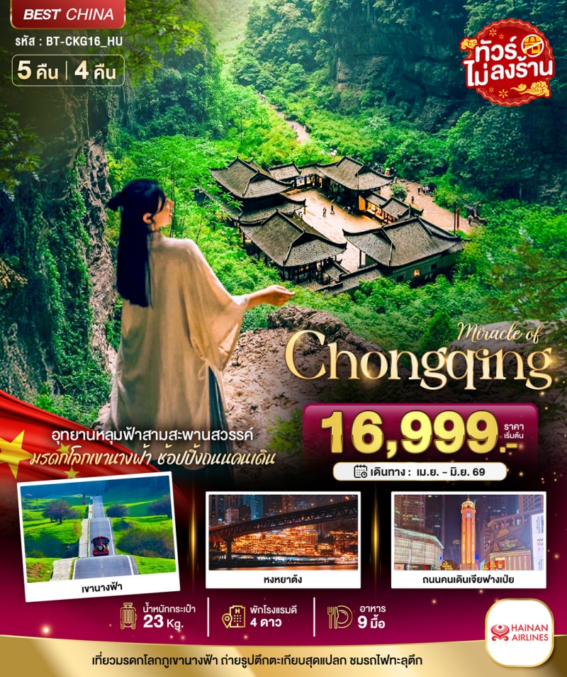 | วันที่ 1 | สนามบินสุวรรณภูมิ • สนามบินฉงชิ่งเจียงเป่ย์ • เมืองฉงชิ่ง • ตึกตะเกียบ • ถนนคนเดินเจียฟางเป่ย์ |