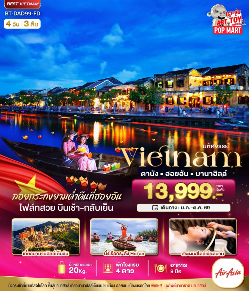 | วันที่ 1 | ดอนเมือง กรุงเทพฯ • ดานัง เวียดนาม • Wonder Park • สะพานมังกร • Apec Park หาดหมีเคว • สระผมสไตล์เวียดนาม |