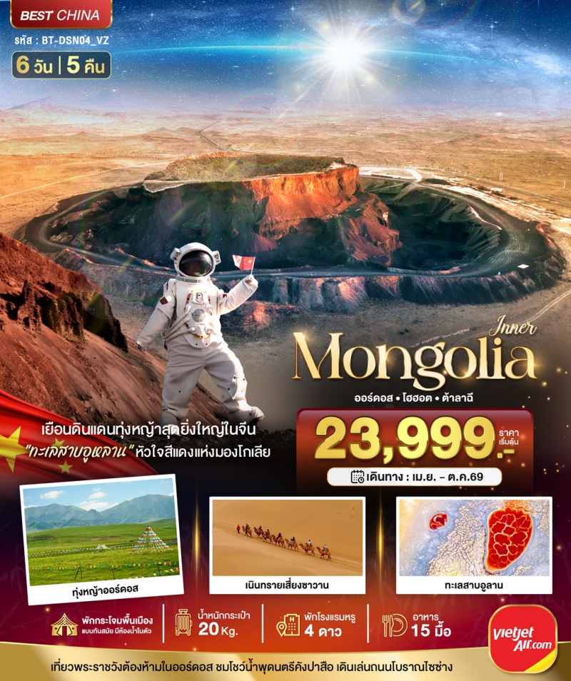 | วันที่ 5 | ทุ่งหญ้าออร์ดอส • พิธีต้อนรับแขกสไตล์มองโกเลีย • สวมชุดมองโกเลีย • เมืองออร์ดอส • ศูนย์ผลิตภัณฑ์เครื่องเงิน | เลือกซื้อออฟชั่นเสริม: ชมโชว์พื้นเมืองเทศกาลนาดัม (จำลอง) |