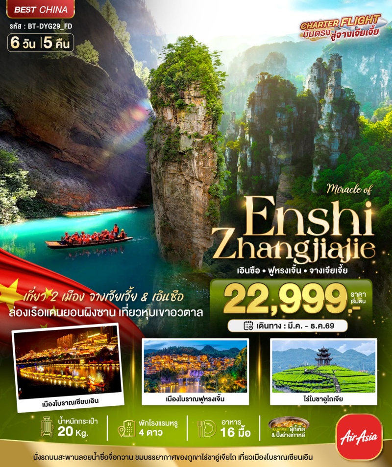 | วันที่ 6 | ร้านยางพารา • พิพิธภัณฑ์ภาพวาดหินทราย • วังโบราณชนเผ่าถูเจีย • สนามบินจางเจียเจี้ยต้าหย่ง • สนามบินดอนเมือง | เลือกซื้อออฟชั่น: สะพานแก้วข้ามหุบเขาแกรนด์แคนยอน – แว่น 3DVTR – บอลลูนเทียม |