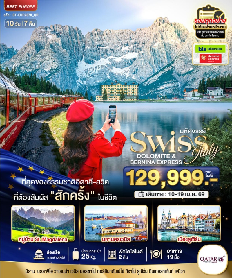 | วันที่ 7 | ทิราโน่ • นั่งรถไฟ BERNINA EXPRESS • เซนต์มอริตซ์ • ลูเซิร์น • อนุสาวรีย์สิงโต • สะพานไม้ชาเปล • เขตเมืองเก่า |