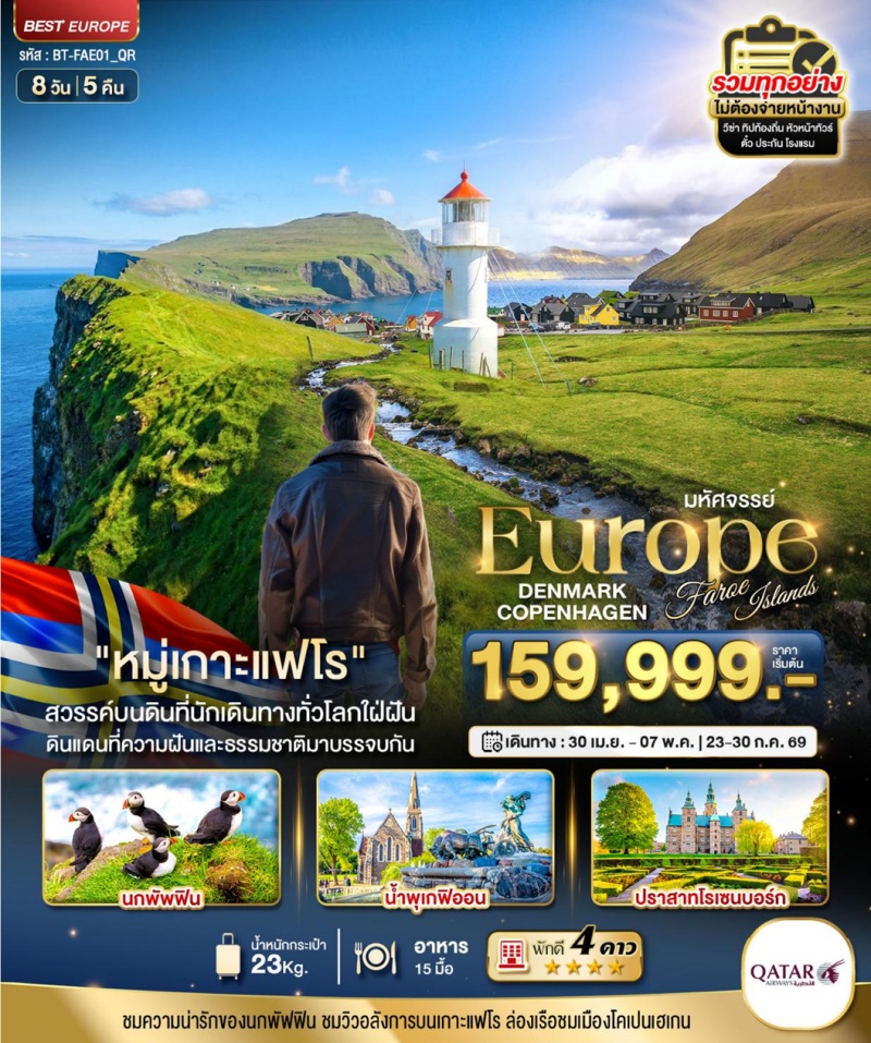 | วันที่ 2 | สนามบินโดฮา – สนามบินโคเปนเฮเกน – สนามบินวาการ์ -เกาะแฟโร – เมืองธอร์สฮาวน์ – โบสถ์เวสตูร์ชีชยัน – อาสนวิหารทอร์สเฮาน์ – ป้อมปราการและประภาคารเก่าแก่ – ถนนเลียบท่าเรือ |