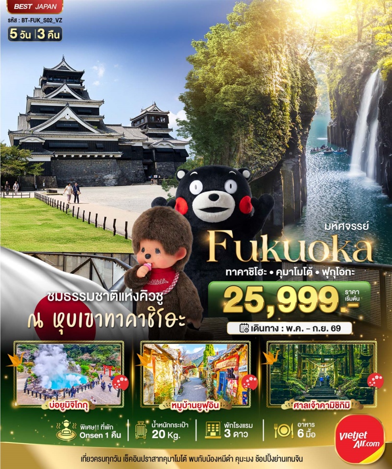 | วันที่ 2 | เมืองฟุกุโอกะ • ศาลเจ้าดาไซฟุ • หมู่บ้านยูฟุอินฟลอร์รัล • ทะเลสาบคินริน • เมืองเบปปุ • บ่อยูมิ จิโกกุ |