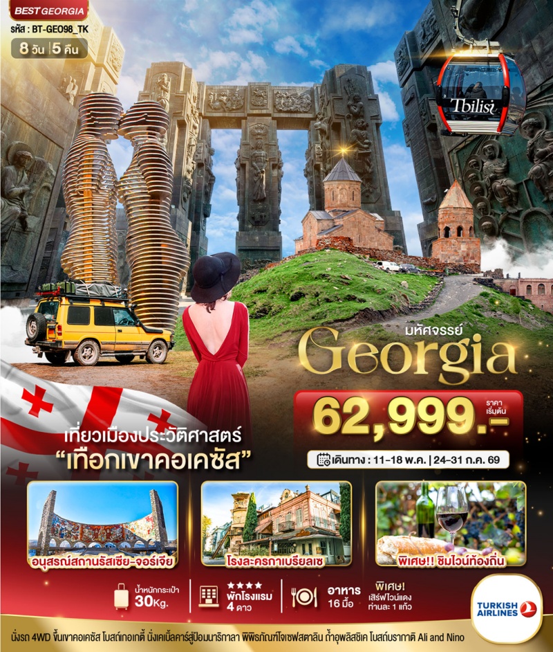 | วันที่ 7 | โรงอาบน้ำโบราณ • ถนนคนเดินชาเดอนี่ • โรงละครกาเบรียลเซ • สะพานแห่งสันติภาพ นั่ง Cable Car สู่ป้อมนาริกาลา • ช้อปปิ้งFreedom Square • สนามบินทบิลิซี • สนามบินอิสตันบูล ตุรเคีย |