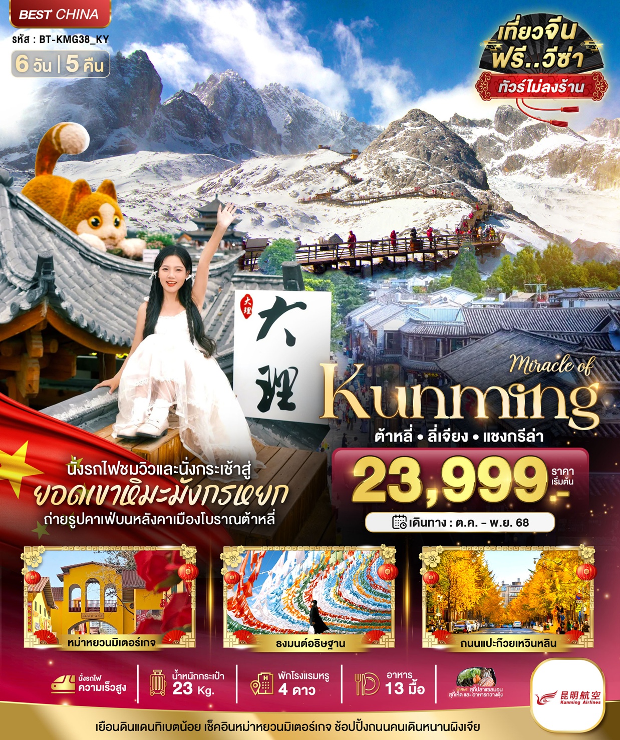| วันที่ 5 | อุทยานมังกรหยก • นั่งกระเช้าขึ้นภูเขาหิมะมังกรหยก • โชว์ความประทับใจลี่เจี่ยง (โชว์จางอี้โหม่ว) • อุทยานน้ำหยก • ทะลสาบไป๋สุยเหอ • สถานีรถไฟความเร็วสูง • เมืองคุนหมิง |