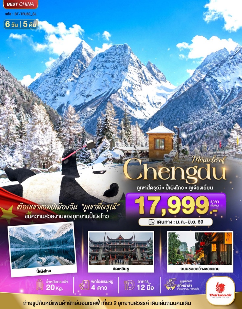 | วันที่ 6 | ร้านผ้าไหม • วัดเหวินซู • ถนนโบราณซอยกว้างซอยแคบ • สนามบินเฉิงตูเทียนฝู • สนามบินสุวรรณภูมิ |