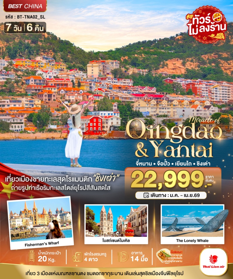 | วันที่ 3 | หาดวาฬโดดเดี่ยว (The Lonely Whale) • ท่าเรือชาวประมงไฮชาง (Fisherman’s Wharf) • เมืองเก่าส่อเฉิงหลี • ถนนคนเดินเฉาหยาง • เมืองชิงเต่า • โบสถ์เซนต์ไมเคิล • ถนนวัฒนธรรมต้าเปา • ย่านเมืองเก่าสไตล์เยอรมัน-จีน • สะพานจ้านเฉียว • ถนนคนเดินจงซาน |