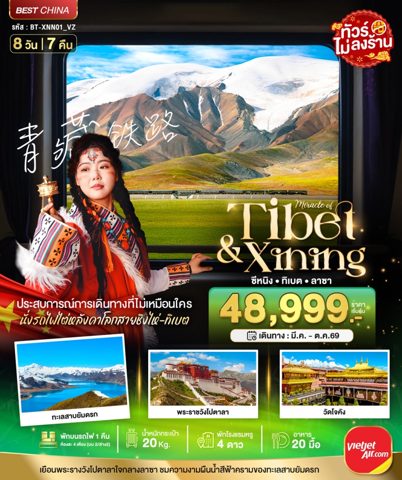 | วันที่ 2 | สนามบินซีหนิงเฉาเจียผู่ • สนามบินลาซาก้งก๋า (บินภายใน) • เมืองลาซา • ชมวิวยามค่ำคืนพระราชวังโปตาลา |