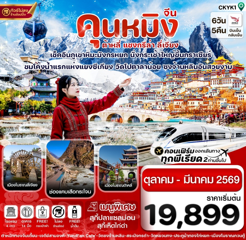 | วันที่ 5 | อุทยานภูเขาหิมะมังกรหยก (รวมค่ากระเช้าใหญ่ ไป-กลับ) ชมการแสดง Impression of Lijiang – ธารน้ำขาว ไป๋สุ่ยเหอ (รวมค่ารถแบตเตอรี่)–รถไฟความเร็วสูงกลับสู่เมืองคุนหมิง (ใช้รถขนกระเป๋ากลับคุนหมิง) |