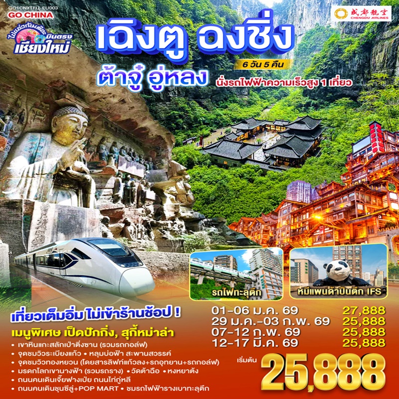 | วันที่ 5 | ฉงชิ่ง-เฉินตู(โดยรถไฟความเร็วสูง ที่นั่งชั้น2) – ถนนโบราณสามก๊กจิ๋นหลี่ – ถนนคนเดินชุนซี– รูปปั้นแพนด้ายักษ์ปีนตึก IFS- ตึกแฝดเฉิงตู – น้ำพุไม่ไผ่ SKP GLOBAL CENTER |
