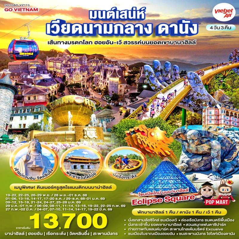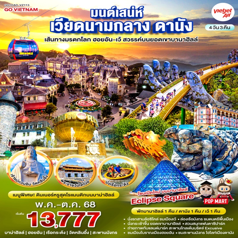 | วันที่ 3 | • ดานัง ยอดเขาบาน่าฮิลล์ • สะพานโกเด้นบริดจ์ • นั่งกระเช้าลงจากบานาฮิลล์ • ช้อปปิ้งร้านผ้าไหม • เดินทางสู่เมืองฮอยอัน • ช้อปปิ้งร้านแกะสลักหินอ่อน • หมู่บ้านกั๊มทาน • ล่องเรือกระด้ง • เมืองโบราณฮอยอัน • เดินทางกลับเมืองดานัง • สะพานแห่งความรัก • รูปปั้นปลามังกร • สะพานมังกร • APEC PARK (พักที่เมืองดานัง 1 คืน) |