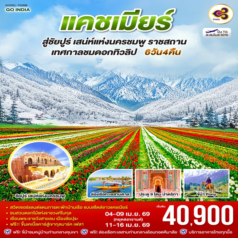 | วันที่ 1 | สนามบินสุวรรณภูมิ (TG323 07.00-09.55) – สนามบินเมืองเดลี – บินภายในประเทศ – ศรีนาคา |