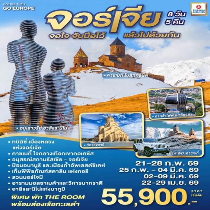 | วันที่ 3 | ทบิลิซี – อนุเสาวรีย์ประวัติศาสตร์จอร์เจีย – อ่างเก็บน้ำชินวารี – มิสเคต้า – วิหารจวารี -วิหารสเวติสโคเวลี – คาซเบกี้ – ขึ้นรถ 4WD สู่ใจกลางเทือกเขาคอเคซัส -โบสถ์เกอร์เกตี้ |
