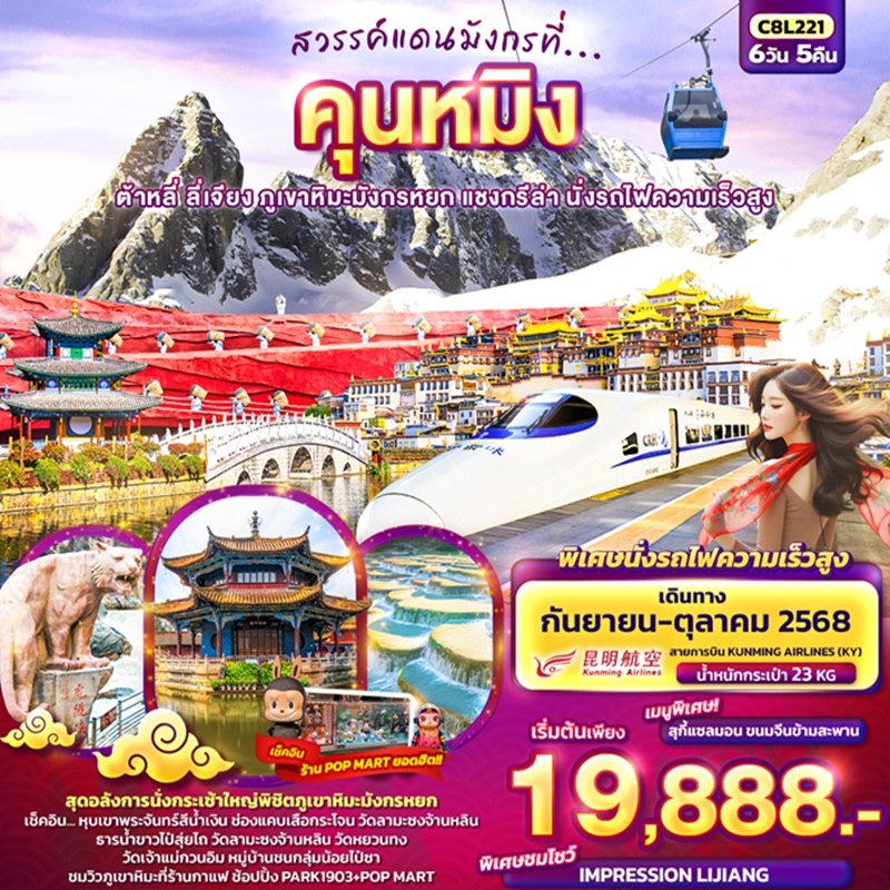 | วันที่ 5 | ภูเขาหิมะมังกรหยก+นั่งกระเช้าใหญ่ – ชมโชว์ IMPRESSION LIJIANG – หุบเขาพระจันทร์สีน้ำเงิน ไป๋สุ่ยเหอ (รวมค่ารถรางไป-กลับ) – ร้านบัวหิมะ – นั่งรถไฟความเร็วสูงสู่คุนหมิง |