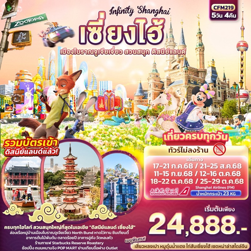 | วันที่ 1 | FM854 BKK-PVG 11.50-17.10 ท่าอากาศยานนานาชาติสุวรรณภูมิ – ท่าอากาศยานนานาชาติซ่างไห่ผู่ตง (เซี่ยงไฮ้) – นครเซี่ยงไฮ้ – เมืองใหม่ผู่ตง – หาดไว่ทาน – ย่านซินเทียนตี้ |
