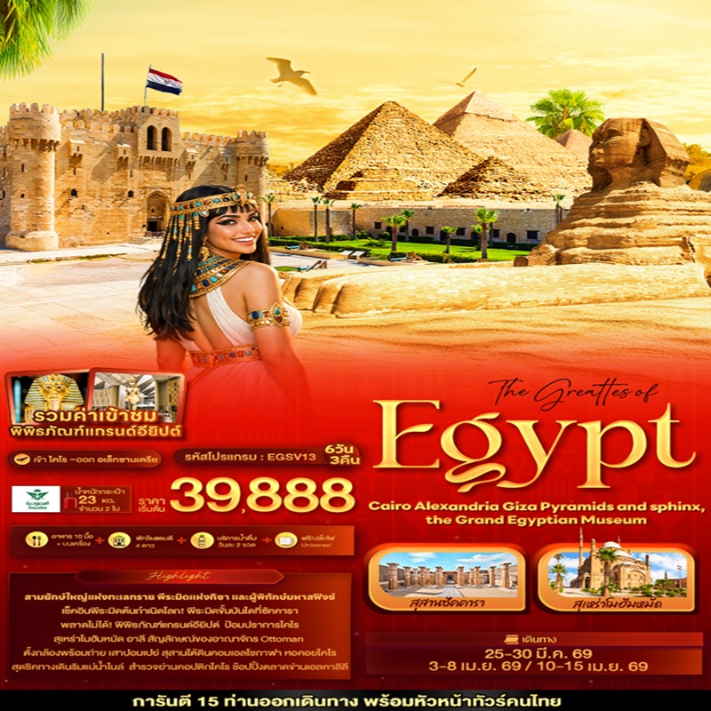 | วันที่ 5 | ห้องสมุดอเล็กซานเดรีย – เสาปอมเปย์ – สุสานใต้ดินคอมเอลโชกาฟา – ท่าอากาศยานนานาชาติบอร์ก เอล อาหรับ ประเทศอียิปต์ – ท่าอากาศยานนานาชาติคิงอับดุลอาซิซ ประเทศซาอุดีอาระเบีย แวะพักเปลี่ยนเครื่อง SV410 HBE-JED 19.30-23.05 |