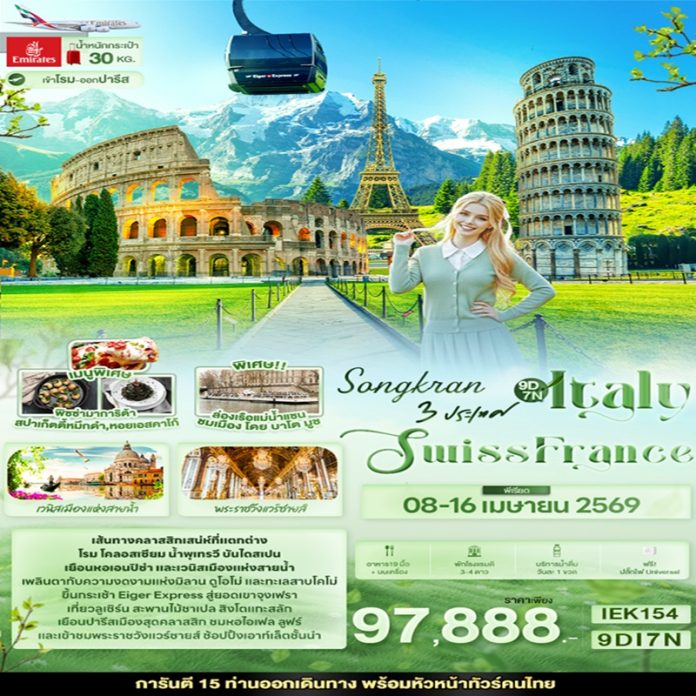 | วันที่ 1 | EK375 BKK-DXB 09.30-13.00 ท่าอากาศยานนานาชาติสุวรรณภูมิ ประเทศไทย – ท่าอากาศยานนานาชาติดูไบ ประเทศสหรัฐอาหรับเอมิเรต แวะพักเปลี่ยนเครื่อง – ท่าอากาศยานนานาชาติเลโอนาร์โด ดา วินชี-ฟีอูมีชีโน ประเทศอิตาลี EK095 DXB-FCO 15.45-20.05 – กรุงโรม |