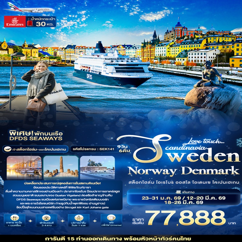 | วันที่ 2 | EK385 BKK-DXB 01.05-04.55 ท่าอากาศยานนานาชาติสุวรรณภูมิ – ท่าอากาศยานนานาชาติดูไบ สหรัฐอาหรับอามิเรตส์ แวะพักเปลี่ยนเครื่อง – ท่าอากาศยานนานาชาติสตอกโฮล์ม อาร์ลันดา ประเทศสวีเดน EK157 DXB-ARN 08.20-12.40 – เมืองสตอกโฮล์ม – พิพิธภัณฑ์วาซา – ย่านเมืองเก่า Gamla Stan |