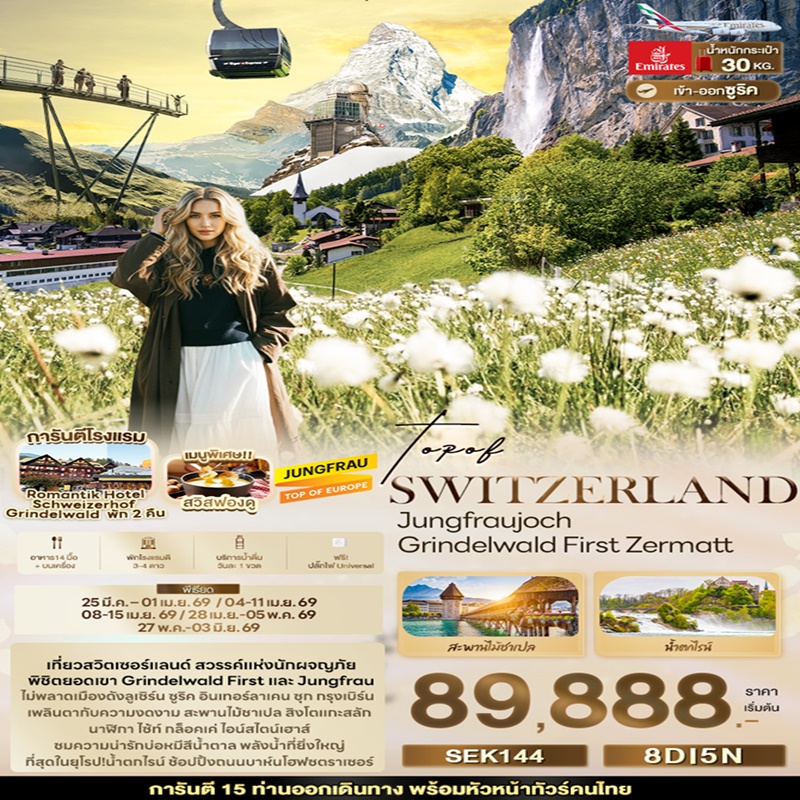 | วันที่ 2 | EK385 BKK-DXB 01.05-04.55 ท่าอากาศยานนานาชาติสุวรรณภูมิ – ท่าอากาศยานนานาชาติดูไบ แวะพักเปลี่ยนเครื่อง – ท่าอากาศยานนานาชาติซูริค ประเทศสวิตเซอร์แลนด์ EK087 DXB-ZRH 08.25-12.25 – เมืองลูเซิร์น – สิงโตหินแกะสลัก – สะพานไม้ชาเปล |