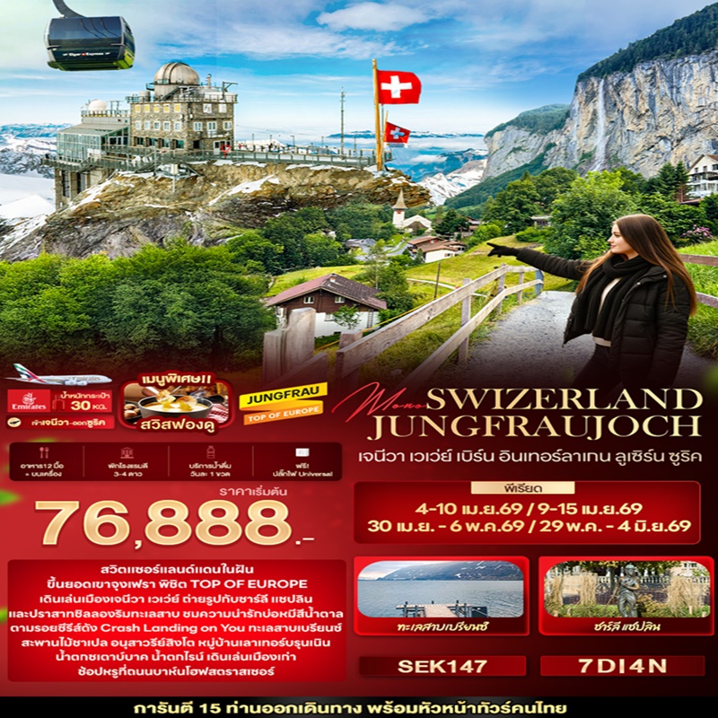 | วันที่ 4 | สถานีกรินเดลวัลด์ – ขึ้นกระเช้าไอเกอร์ เอ็กเพรส สู่ สถานีไอเกอร์เกลตเชอร์ – ต่อรถไฟ สู่ สถานีรถไฟจุงเฟรายอร์ค – ปราสาทน้ำแข็ง – อัลไพน์ เซนเซชัน – สฟิงซ์ฮอลล์ –รถไฟไต่เขาลงจากยอดเขาจุงเฟรา – ลงกระเช้าไอเกอร์ เอ็กเพรส สู่ สถานีกรินเดลวัลด์ – เมืองเลาเทอร์บรุนเนิน – น้ำตกชเตาบ์บาค – หมู่บ้านอิเซลท์วอลด์ – ทะเลสาบเบรียนซ์ – เมืองลูเซิร์น |