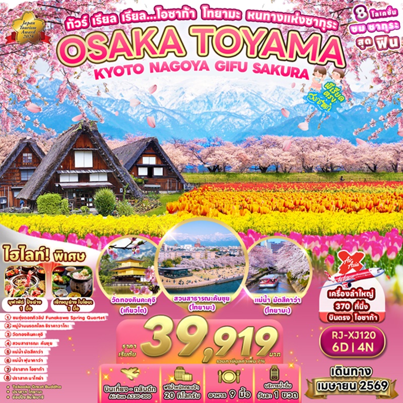 | วันที่ 4 | เมืองอาซาฮี-ชมทุ่งดอกทิวลิป ASAHI FUNAKAWA SPRING QUARTET-ชมดอกซากุระริมแม่น้ำ ฟุนาคาว่า-ชมดอกซากุระสวนสาธารณะคันซุย- จังหวัดกิฟุ |