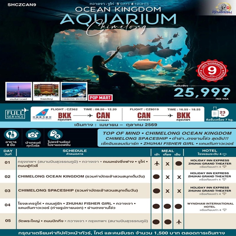 | วันที่ 2 | CHIMELONG OCEAN KINGDOM (รวมค่าบัตรเข้าสวนสนุกเต็มวัน) |