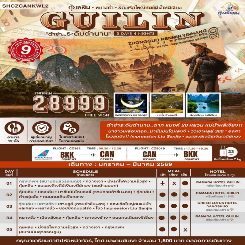 | วันที่ 5 | กุ้ยหลิน, นั่งรถไฟความเร็วสูง, กวางเจา, กรุงเทพฯ (สนามบินสุวรรณภูมิ) |