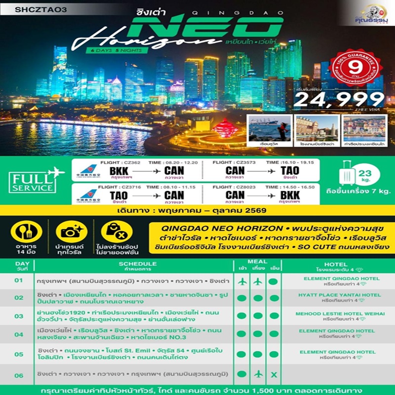 | วันที่ 6 | ชิงเต่า, กวางเจา, กวางเจา, กรุงเทพฯ (สนามบินสุวรรณภูมิ) |