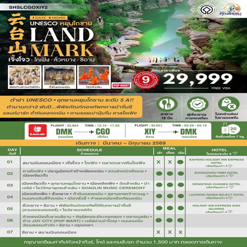 | วันที่ 1 | สนามบินดอนเมือง • เจิ้งโจว • ไคเฟิง • ตลาดกลางคืนไคเฟิง |