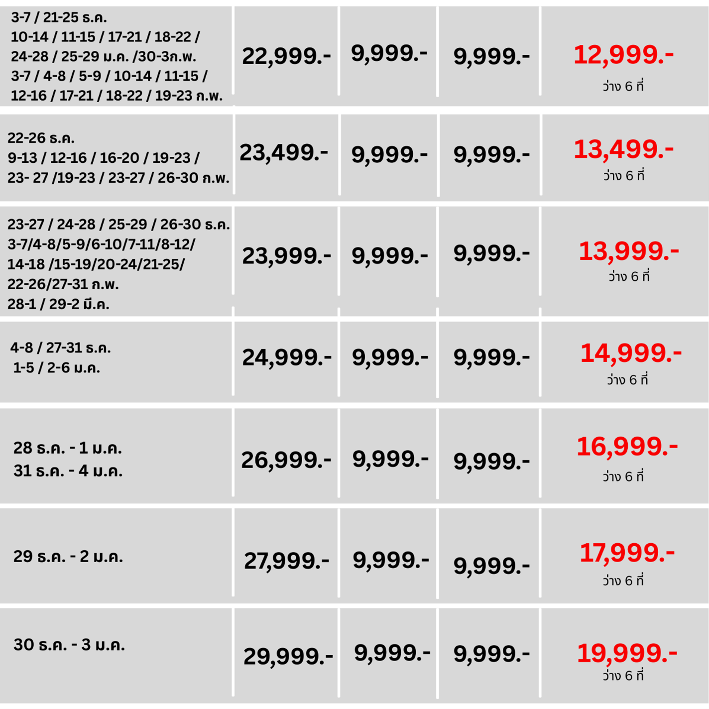| วันที่ 5 | ศูนย์เครื่องสำอาง – ศูนย์น้ำมันสนเข็มแดง – ศูนย์โสม/สมุนไพร – ร้านซุปเปอร์ขนมของฝาก – สนามบินสุวรรณภูมิ ประเทศไทย |