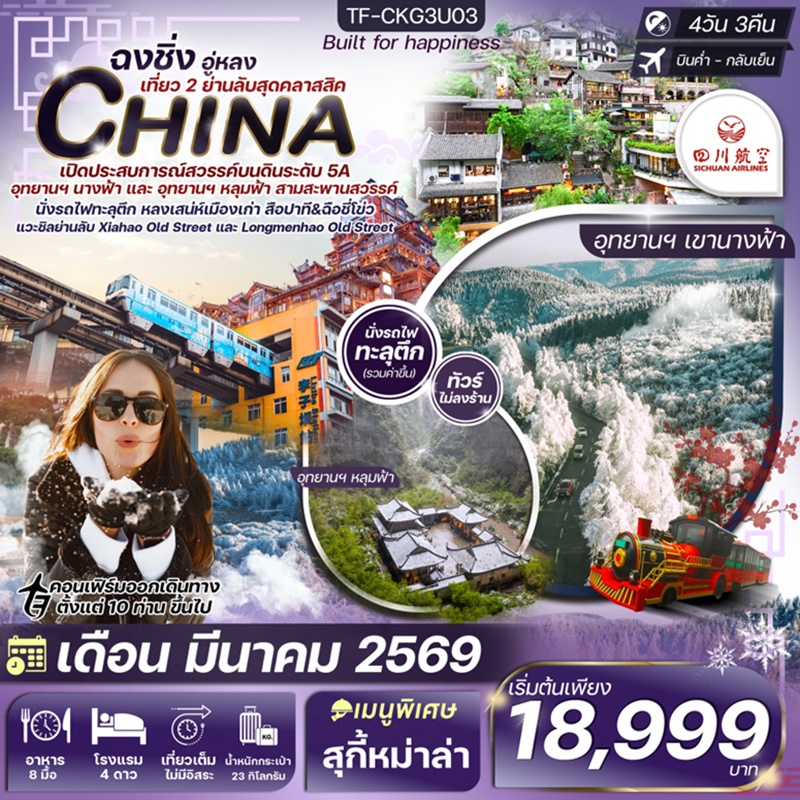 วันที่ 1 กรุงเทพฯ-ฉงชิ่ง-รับคณะที่สนามบินฉงชิ่ง-เดินทางเข้าที่พัก (BKK-CKG 3U3772 / 19.20-23.40)