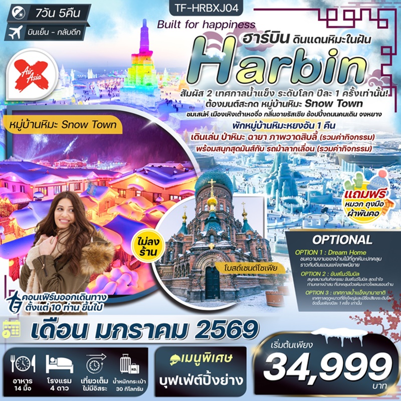 | วันที่ 2 | ฮาร์บิน-ร้านเสื้อกันหนาว-เข้าที่พัก-หมู่บ้านหิมะ Xuexiang (รวมค่าเข้า รถรับ-ส่ง)-ป้ายหินใหญ่-พิพิธภัณฑ์หมู่บ้านหิมะ+ ที่ทำการไปรษณีย์เมืองหิมะ-ถนนเสวี่ยยุ่นเจีย-Dream Home(ไม่รวมค่าเข้า) OPTION: Dream Home (ราคา 198 หยวน/คน) |