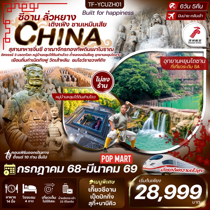 | วันที่ 5 | เจดีย์ห่านป่าใหญ่ – ถนนคนเดินต้าถัง+Pop Mart -กำแพงเมืองโบราณ -จัตุรัสหอกลอง – นั่งรถไฟความเร็วสูงสู่เมืองหยุนเฉิง |