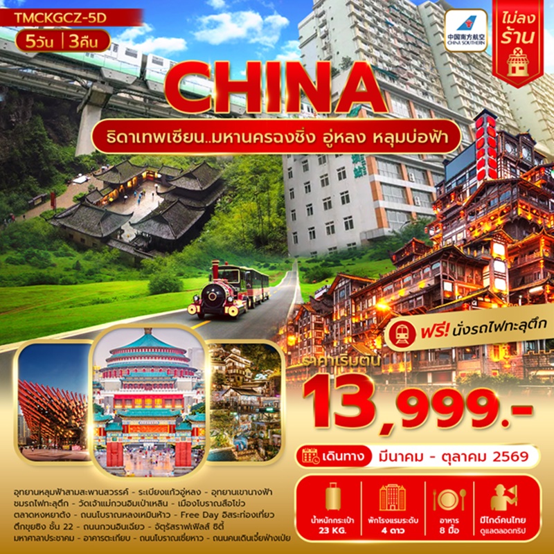 | วันที่ 5 | ตึกขุยซิง ชั้น 22 + ถนนกวนอินเฉียว + จัตุรัสราฟเฟิลส์ ซิตี้ ฉงชิ่ง+มหาศาลาประชาคม+อาคารตะเกียบ+ถนนโบราณเซี่ยหาว+ถนนคนเดินเจี๋ยฟ่างเป่ย + เดินทางสู่สนามบินฉงชิ่ง+เดินทางกลับกรุงเทพ CZ2361 CKG-BKK 21.15-23.30 |