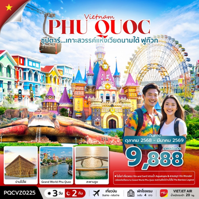 | วันที่ 2 | สวนสนุก Vin wonder – วินเพิร์ล อควาเรียม – Grand World Phu Quoc – บ้านไม้ไผ่ – อิสระชมโชว์ แสง สี เสียง ที่ Grand World หรือ Corona Casino |