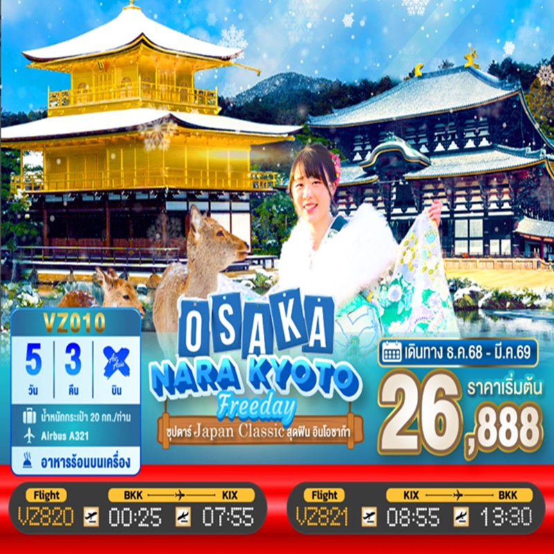 | วันที่ 2 | ท่าอากาศยานนานาชาติคันไซ โอซาก้า – เมืองนารา – วัดโทไดจิ – สวนนารา – เมืองเกียวโต – การเรียนพิธีชงชาญี่ปุ่น – วัดคินคะคุจิ หรือ วัดทอง – เมืองโอซาก้า – ช้อปปิ้งชินไซบาชิ |
