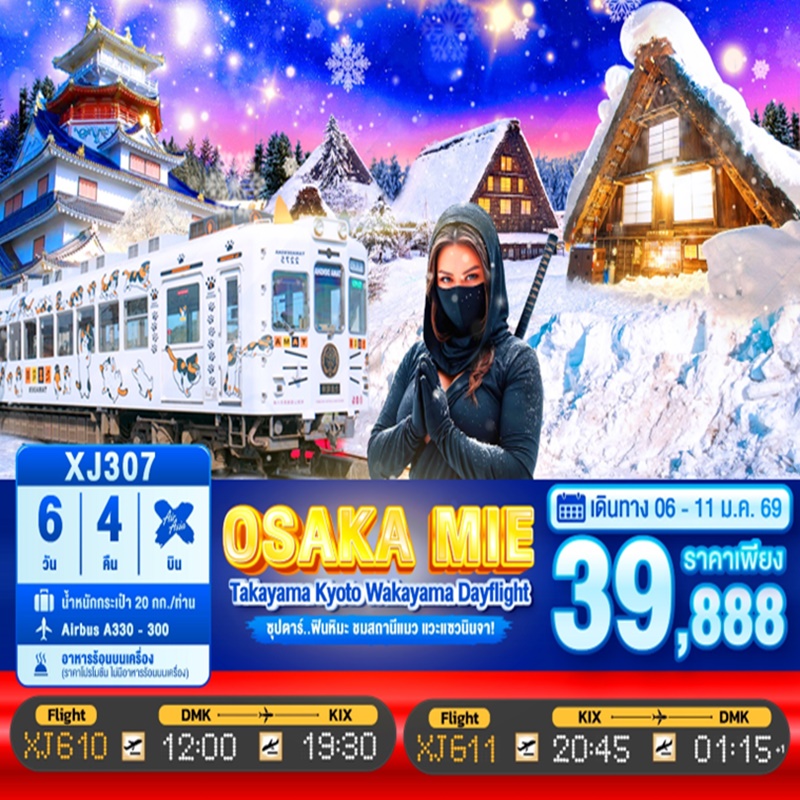 | วันที่ 5 | เมืองโอซาก้า – ศาลเจ้านัมบะยาซากะ – เมืองวาคายาม่า – ตลาดปลาคุโรชิโอ – นั่งรถไฟสู่สถานีแมว (Wakayama St.- Kishi St.) – ห้างอิออน มอลล์ ริงกุ เซนัน – ท่าอากาศยานนานาชาติคันไซ XJ611 (20:45 – 01:15+1) |