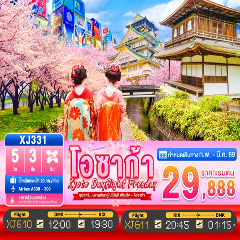| วันที่ 1 | ท่าอากาศยานนานาชาติดอนเมือง กรุงเทพฯ – ท่าอากาศยานนานาชาติคันไซ โอซาก้า XJ610 (12:00 – 19:30) |