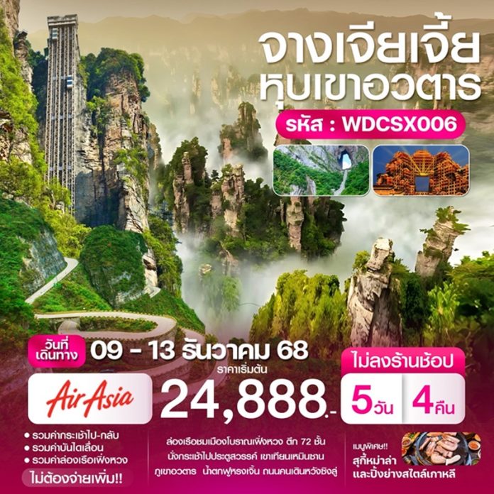 | วันที่ 3 | เมืองจางเจียเจี้ย • เขาเทียนเหมินซาน (รวมกระเช้าไป-กลับ/รวมค่าลงบันไดเลื่อน) • ทางเดินกระจก • ตึกมหัศจรรย์ 72 ชั้น |