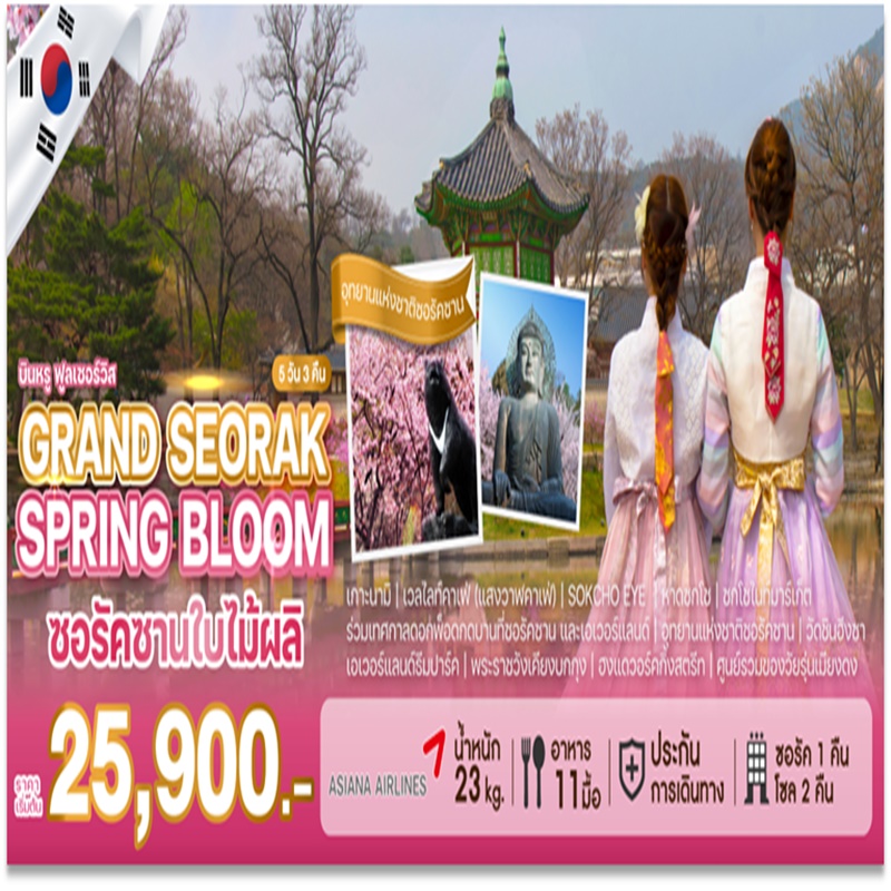 | วันที่ 3 | ร่วมเทศกาลดอกพ็อดกดบาน ที่ซอรัค และเอเวอร์แลนด์ อุทยานแห่งชาติซอรัคซาน | วัดชินฮึงซา (ไม่รวมค่าขึ้นกระเช้า) เอเวอร์แลนด์ธีมปาร์ค (รวมค่าเข้าและบัตรเครื่องเล่นไม่จำกัด) ศูนย์เวชสำอาง | ฮงแดวอร์คกิ้งสตรีท |