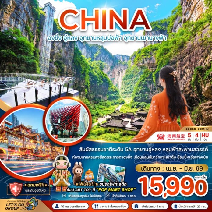 | วันที่ 2 | เมืองอู่หลง – อุทยานแห่งชาติหลุมฟ้า สะพานสวรรค์ – จุดชมวิวระเบียงแก้ว – ลิฟท์แก้ว – อุทยานเขานางฟ้า – นั่งรถรางชมวิว – เมืองฉงชิ่ง |