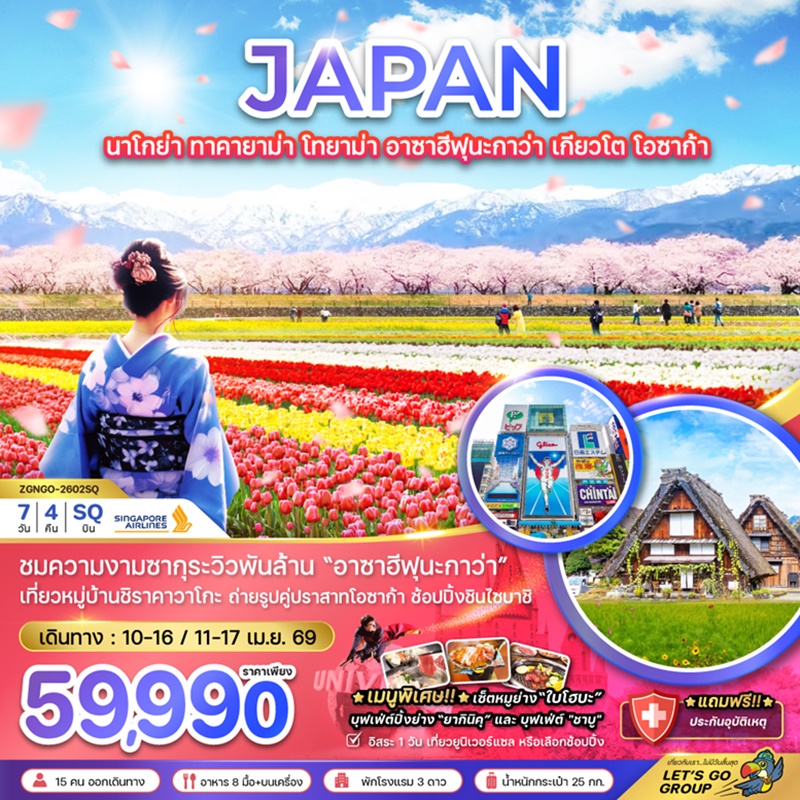 | วันที่ 2 | สนามบินชางงี – สนามบินนาโกย่า – หมู่บ้านชิราคาวาโกะ – ทาคายาม่า ที่ทำการเก่าเมืองทาคายาม่า – เขตเมืองเก่าซันมาชิซึจิ – โทยาม่า |