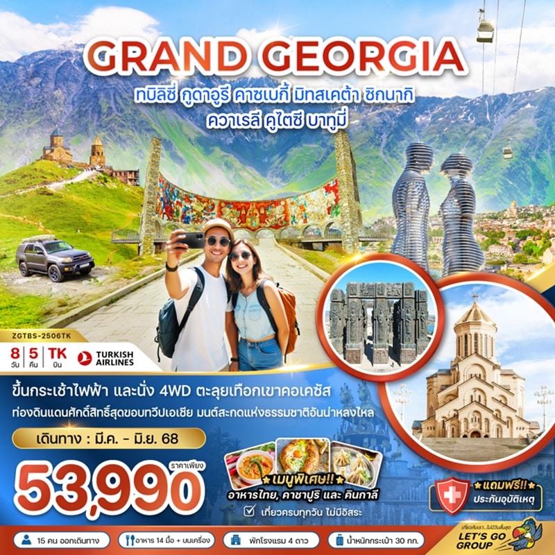 | วันที่ 2 | สนามบินอิสตันบูล – สนามบินทบิลิซี่ – เมืองทบิลิซี่ – โบสถ์ตรีนิตี้ – เมืองมิทสเคต้า – วิหารสเวติสโคเวลี – วิหารจวารี – อนุสาวรีย์ประวัติศาสตร์จอร์เจีย – สะพานแห่งสันติภาพ – ขึ้นกระเช้าไฟฟ้าป้อมนาริคาล่า – มารดาแห่งจอร์เจีย –โรงอาบน้ำโบราณ อะบาโนตูบานี – ถนนคนเดินชาเดอนี่ |