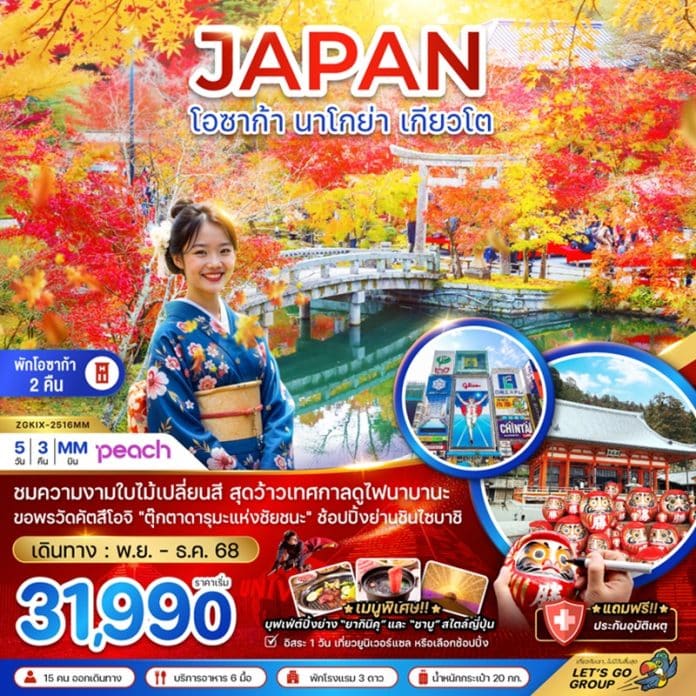 | วันที่ 5 | ศาลเจ้านัมบะ ยาซากะ – ตลาดปลาคุโรมง – ปราสาทโอซาก้า – ริงกุเอาท์เล็ท – สนามบินคันไซ – สนามบินสุวรรณภูมิ ประเทศไทย |
