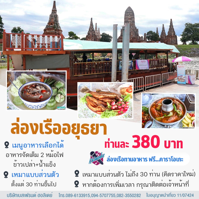 บริษัทเบสเฟรนด์ ฮอลิเดย์ บริการล่องเรือรับประทานอาหาร จ.พระนครศรีอยุธยา ฟรีคาราโอเกะ เรืออยุธยาราคาถูก ล่องเรือรอบเกาะอยุธยา